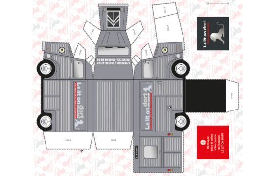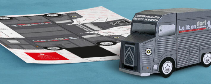 Notre Studio a imaginé un support ludique et différentiant : un camion en papier à découper et monter, reprenant le visuel du véhicule de livraison Le Lit On Dort.